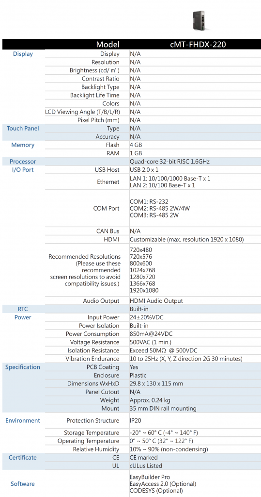 In compliance with IEC 61131-3 Programmable Logic Controller (PLC) standard, cMT-CTRL01’s built-in CODESYS supports multiple languages such as FBD/LD/IL/ST/SFC/CFC. Also, cMT-CTRL01 supports IIoT protocol standards: OPC UA and MQTT with which data from the connected devices can be uploaded to IIoT datacenter. Additionally, users can, with a license, activate EasyAccess 2.0 to update the device’s CODESYS project and monitor its operation status, thus reducing maintenance costs. With EasyAccess 2.0 push notification, users receive immediate notification about the operation errors on their portable devices for quick troubleshooting.